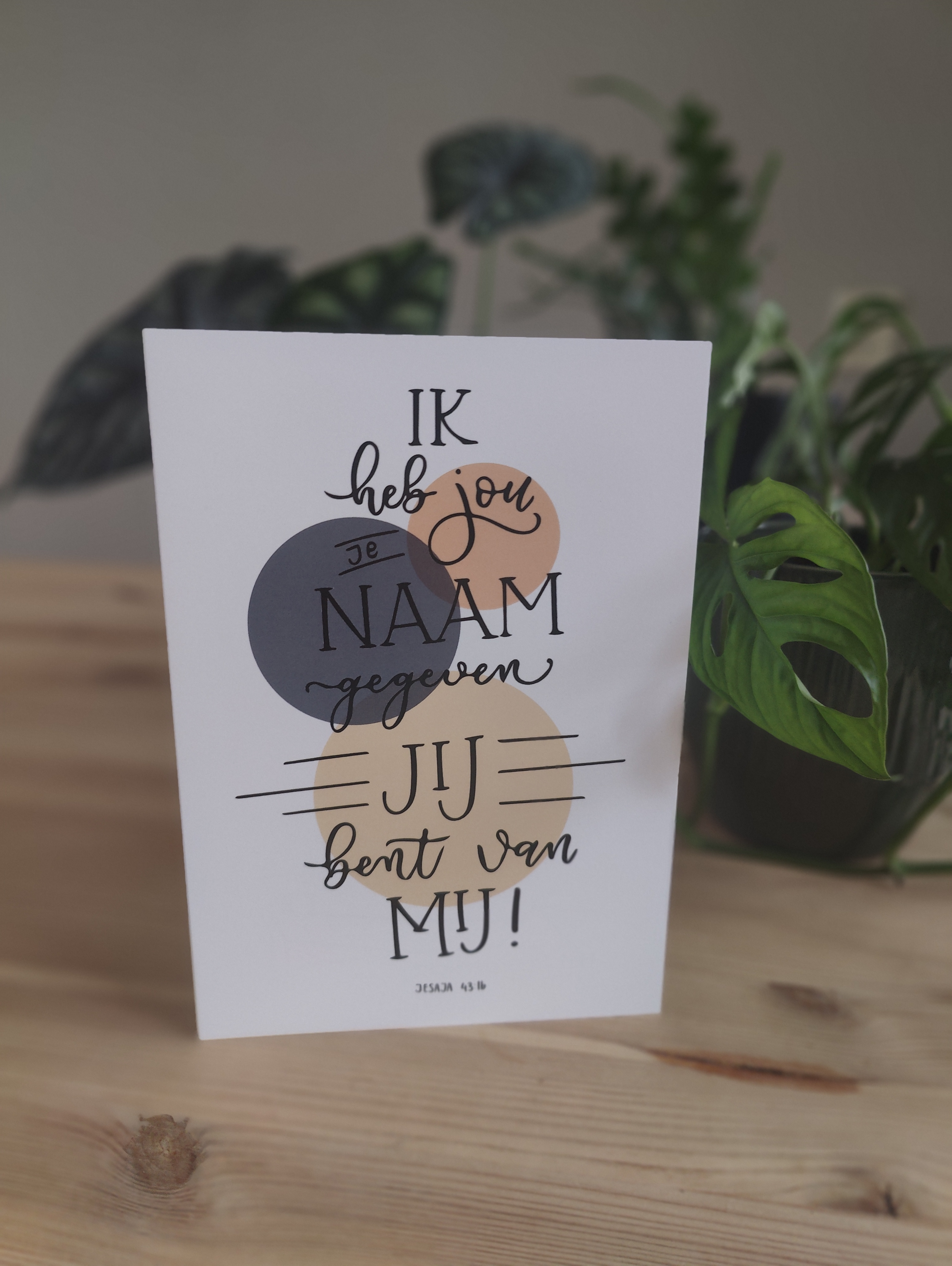 Kijk, dit is een doopkaart. En wat staat daar op? “Ik heb jou je naam gegeven, jij bent van Mij!” Dat zegt de HERE God tegen dit kleine baby’tje. Maar weet je? In de hemel, zegt de Here Jezus, is ook een heel groot boek. En in dat grote boek in de hemel worden ook namen opgeschreven. Elke keer als er een kindje gedoopt wordt, wordt er in de hemel weer een naam in het boek van God bij geschreven. In dat boek staat: jij hoort bij Mij en bij de Here Jezus. En wie z’n naam wordt er straks in de hemel in dat boek geschreven? De naam van dit baby’tje, want die wordt nu gedoopt.