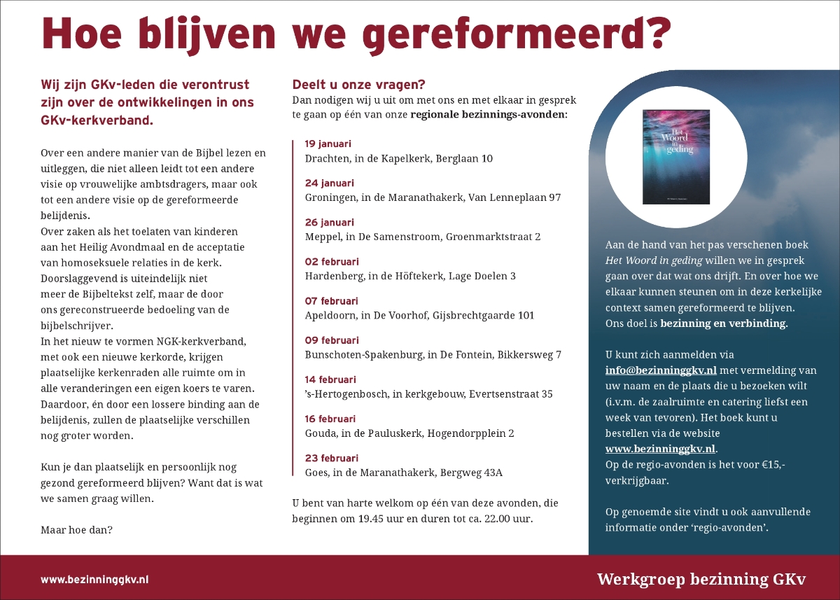 Het is heel goed dat we ons als Nederlandse Gereformeerde Kerken daarover verootmoedigen. In onze tijd zijn we andere bijbelse lijnen en accenten gaan herwaarderen. Het geeft, hoop ik, gelvoige homo’s en lesbiennes ruimte om te kunnen ademen in Gods gemeente. Voor hen geen andere criteria om samen aan het Avondmaal te vieren dat we leven van de liefde van God en van genade die Jezus verdiend heeft, en dat de Heilige Geest van daaruit ons leven stempelt.